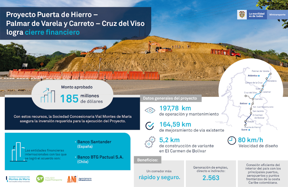 Cartagena, 14 de noviembre de 2019 Un total de 185 millones de dólares fueron aprobados para lograr el cierre financiero que garantiza la inversión requerida para el Proyecto Puerta de Hierro – Palmar de Varela y Carreto – Cruz del Viso, que hace parte de los proyectos de infraestructura de Cuarta Generación del Gobierno Nacional, ejecutados por la Agencia Nacional de Infraestructura ANI, a través de la Concesionaria Vial Montes de María.